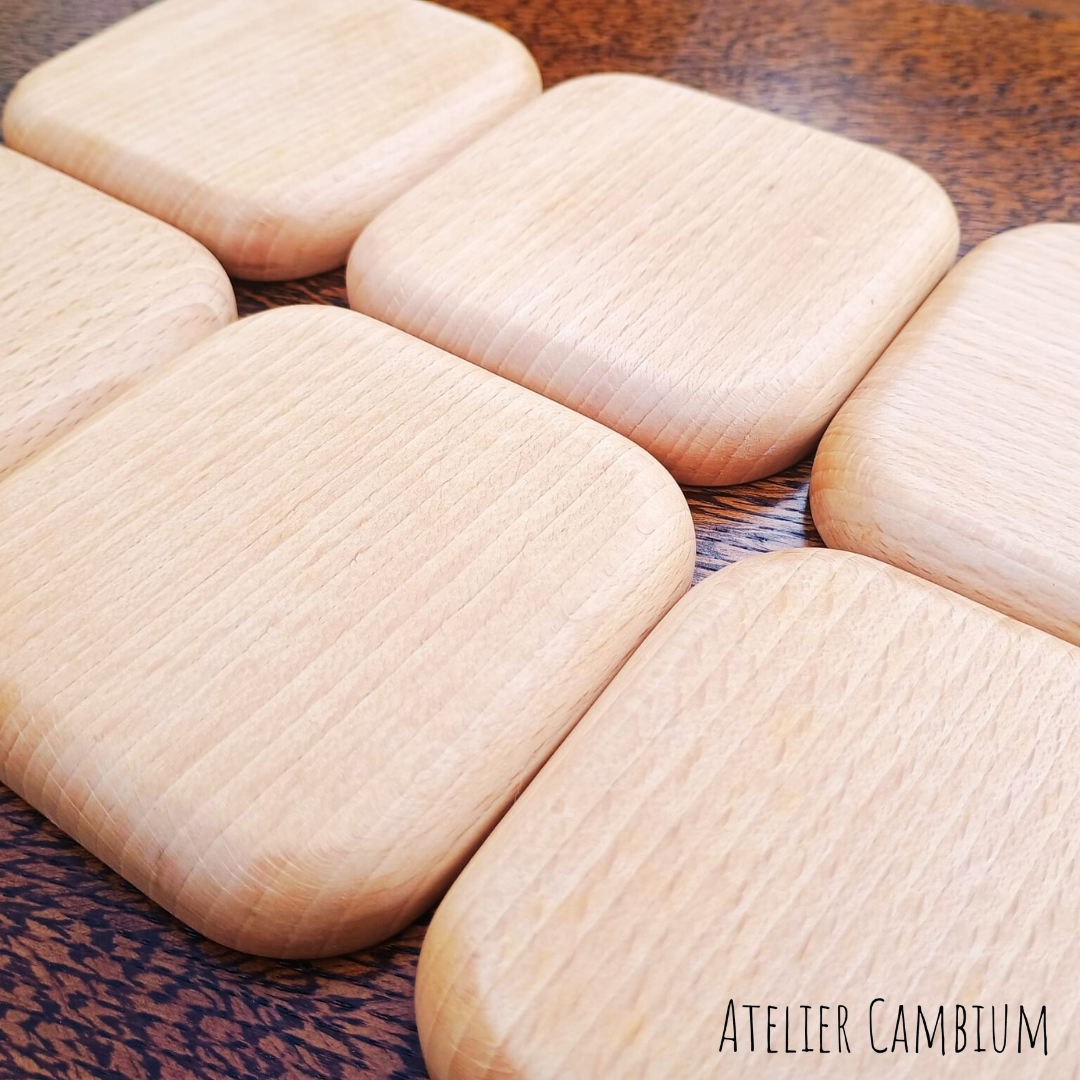 Chaque dessous de verre est façonné avec soin, en valorisant les singularités du hêtre. Les variations de teinte et de veinage font de chaque ensemble une création unique, signée Atelier Cambium, artisane ébéniste.